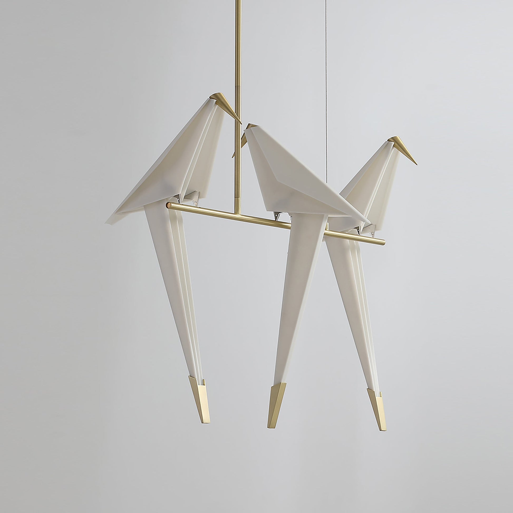 A family of sculptural lamps celebrates the beauty and poetry of a bird perched on a branch, rocking darkness away when set in motion. Crafted from the paper in the form of an abstract bird sitting on a branch, these sunlit birds are free to swing when softly touched, gently glowing and bringing along the promise of spring.