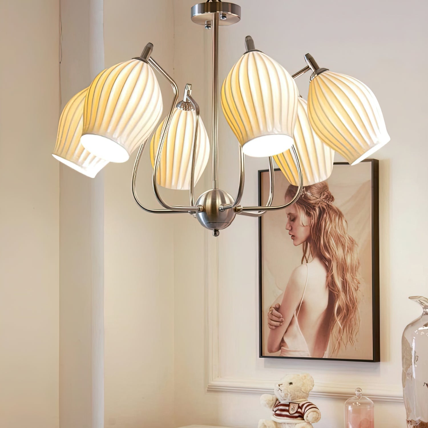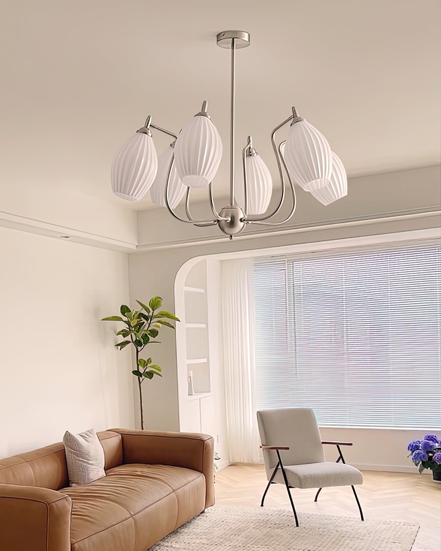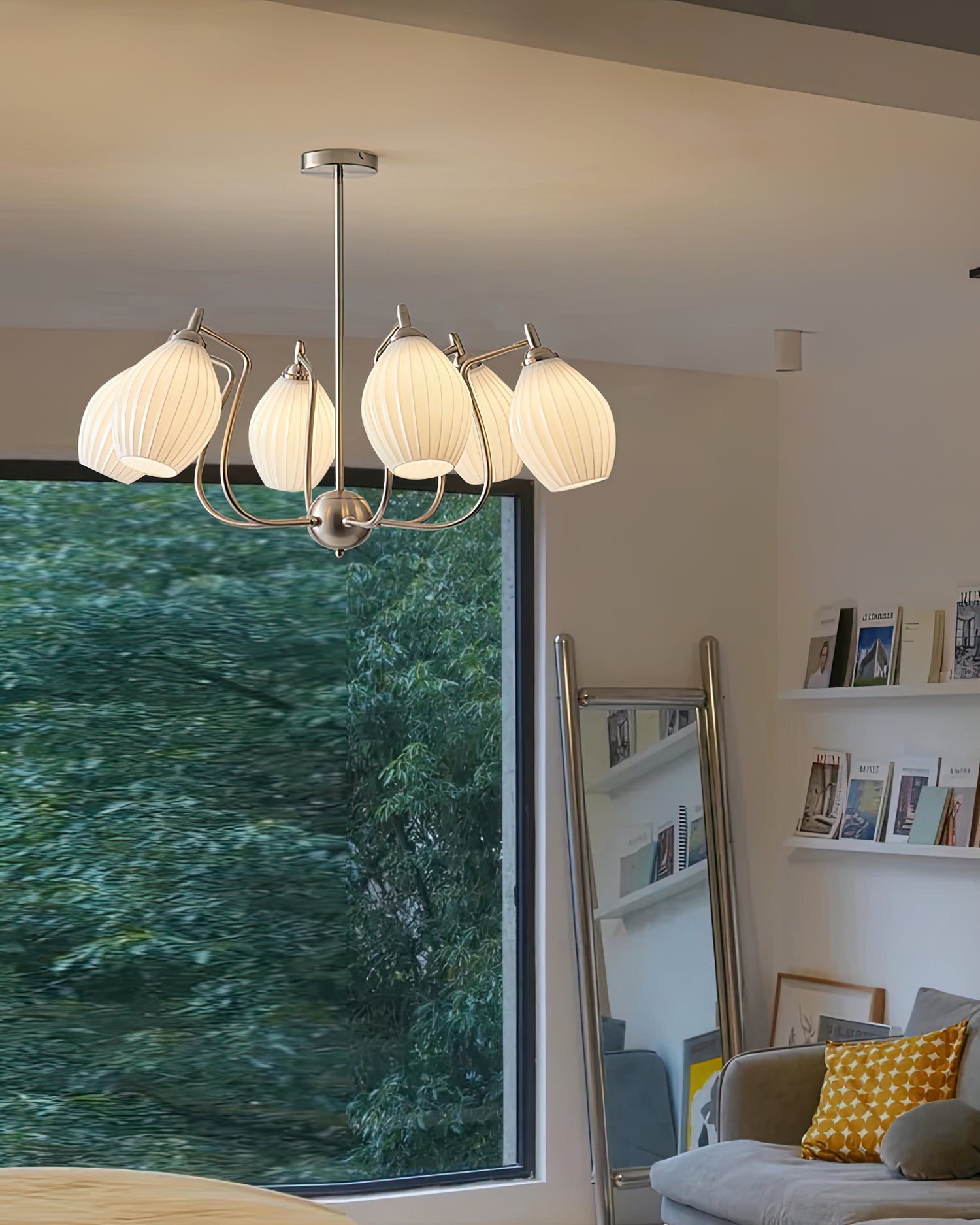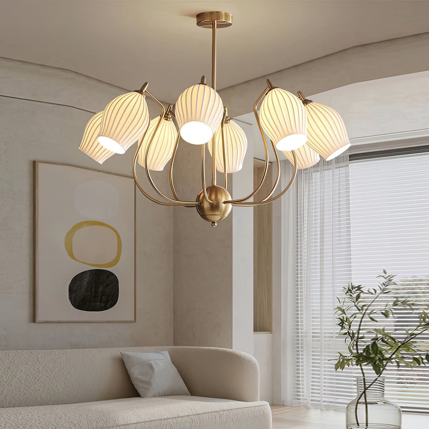 The Petaluma Chandelier features elegantly curved golden arms that mimic flowering stems, supporting a softly textured shade that diffuses light with a warm, natural glow. Its delicate petal-inspired design creates a romantic ambiance, casting gentle halos that transform dining rooms, living areas, or bedrooms into inviting, luxurious spaces. This fixture serves as a refined artistic centerpiece, blending form and function to elevate any interior with subtle sophistication.