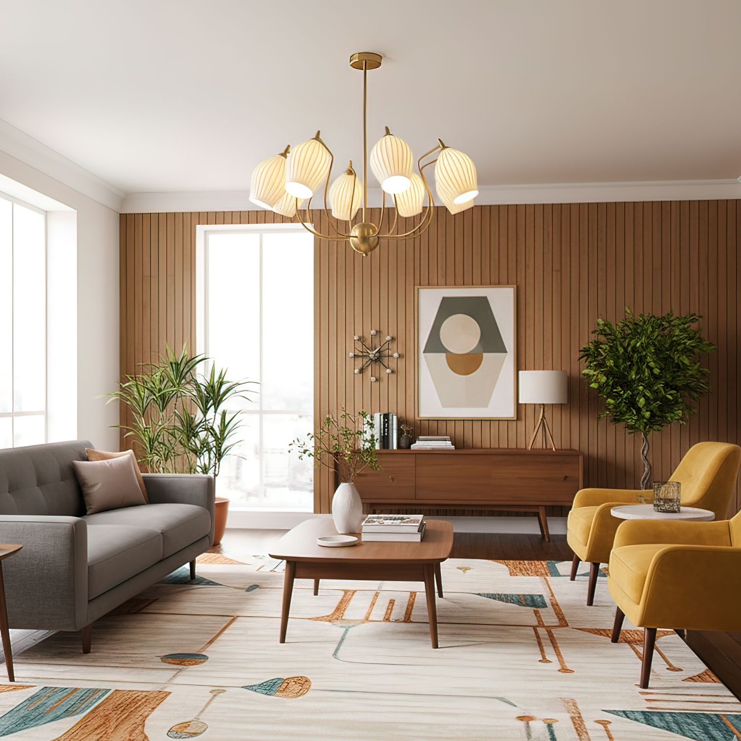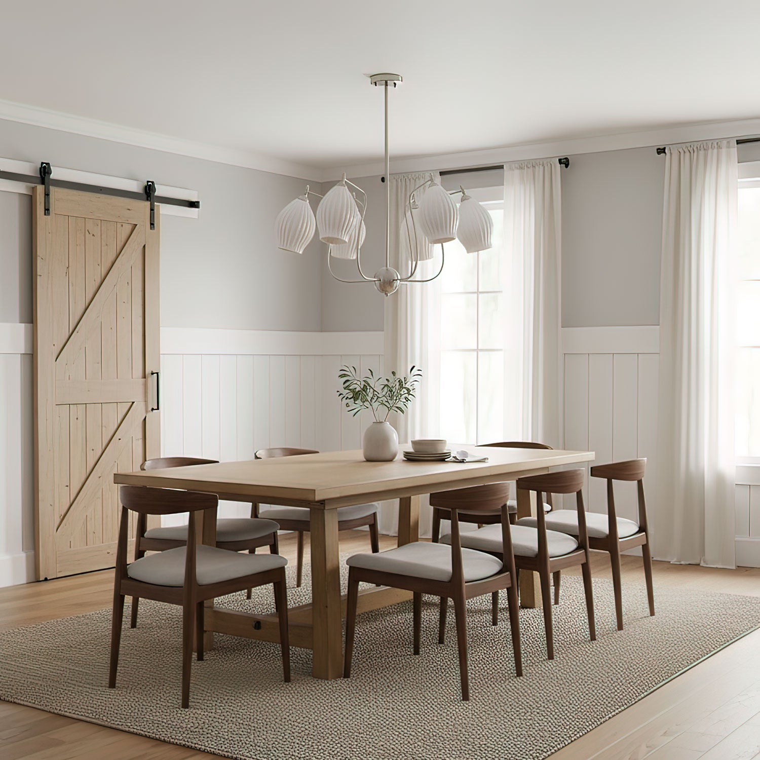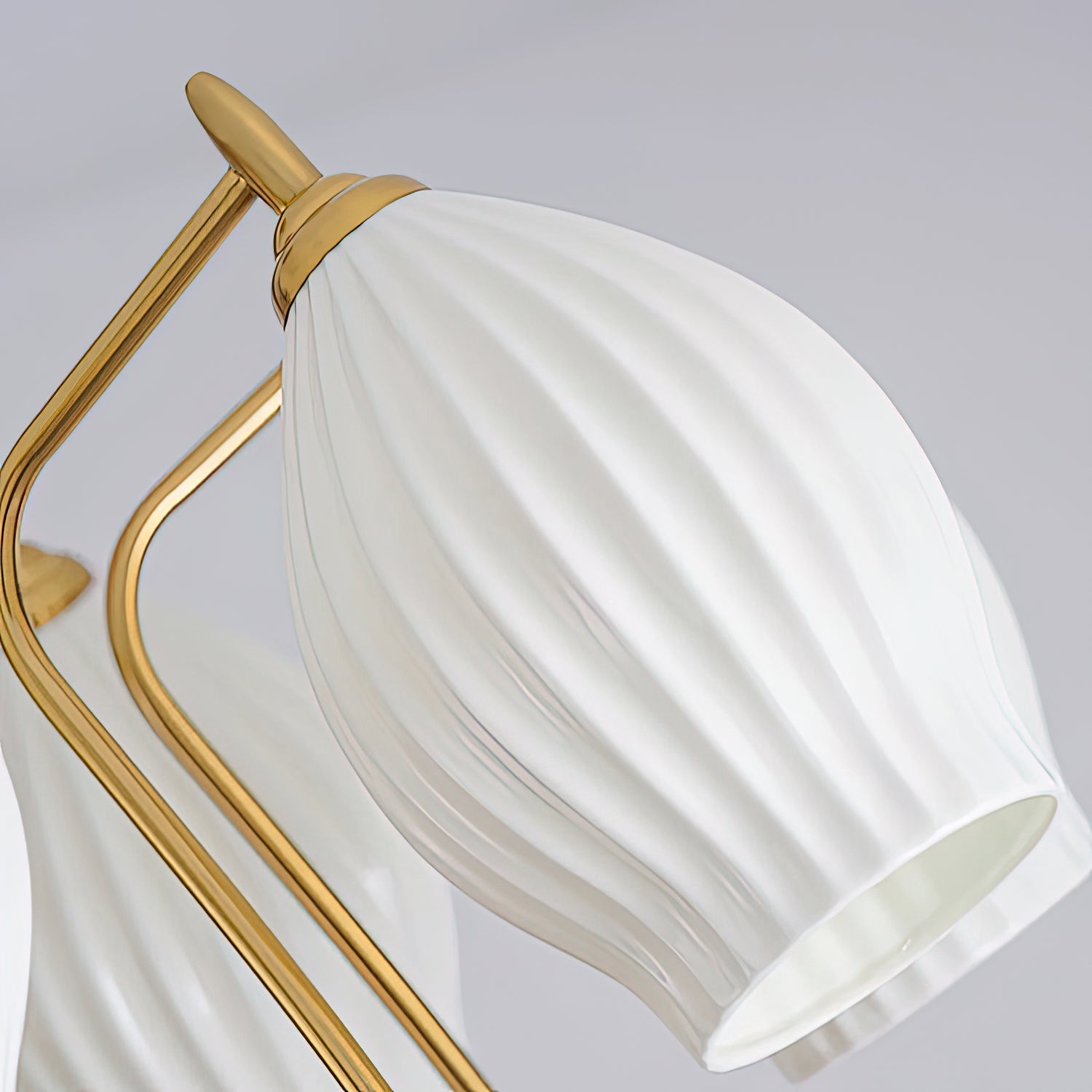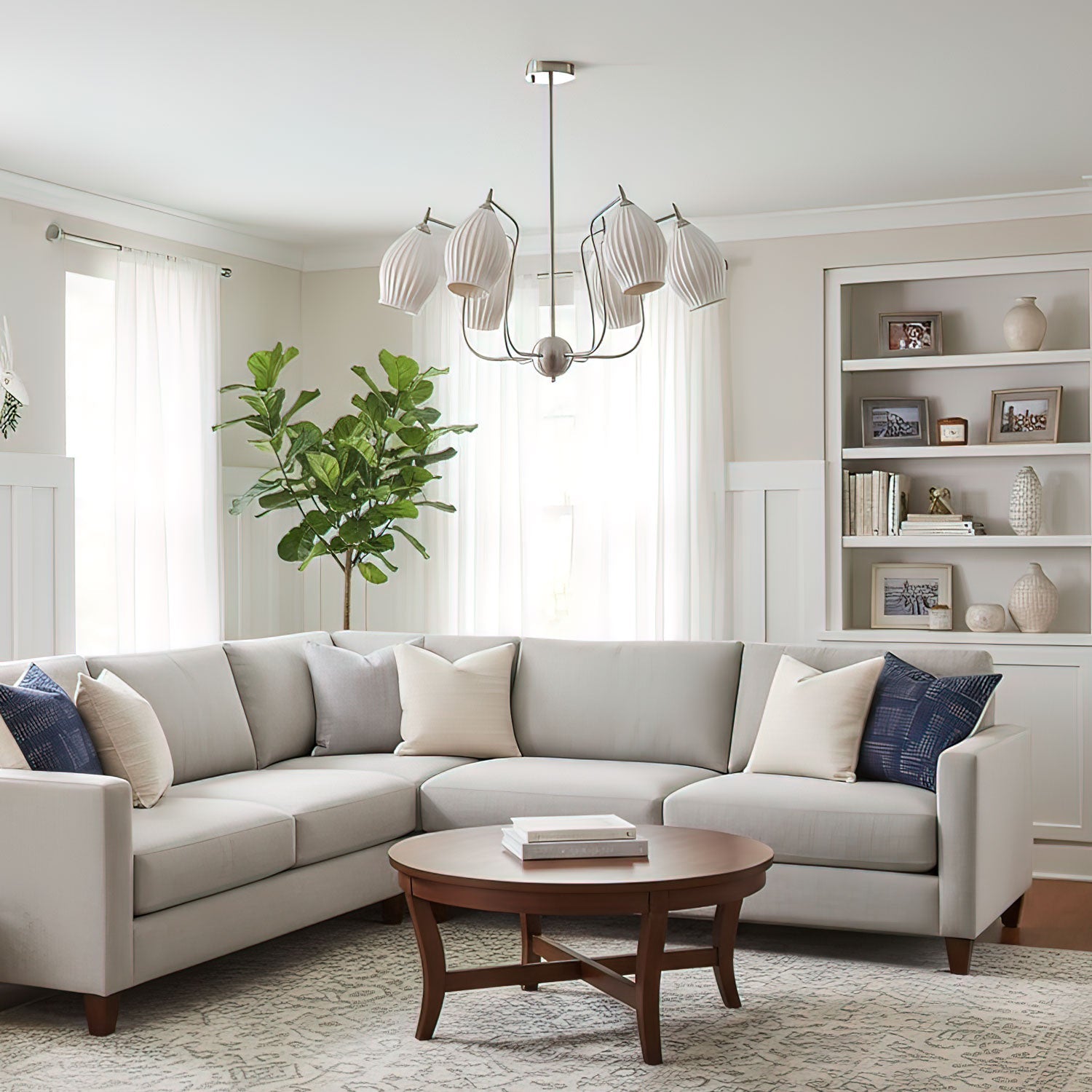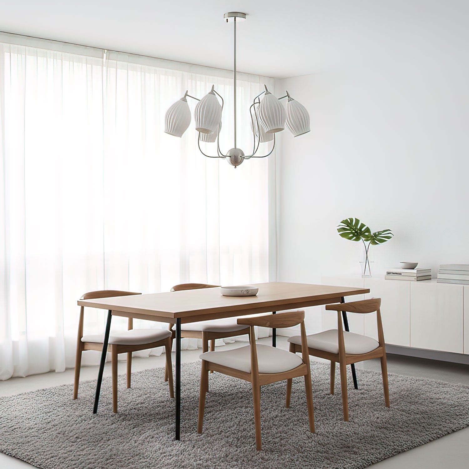 The Petaluma Chandelier features elegantly curved golden arms that mimic flowering stems, supporting a softly textured shade that diffuses light with a warm, natural glow. Its delicate petal-inspired design creates a romantic ambiance, casting gentle halos that transform dining rooms, living areas, or bedrooms into inviting, luxurious spaces. This fixture serves as a refined artistic centerpiece, blending form and function to elevate any interior with subtle sophistication.