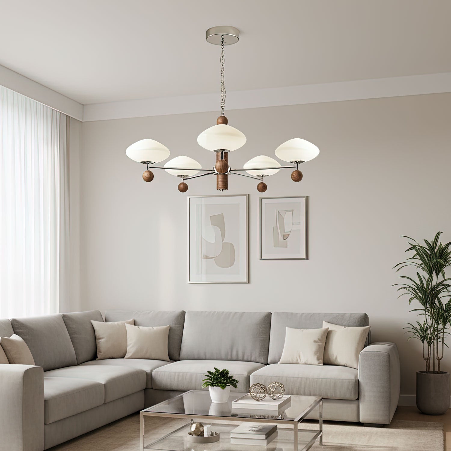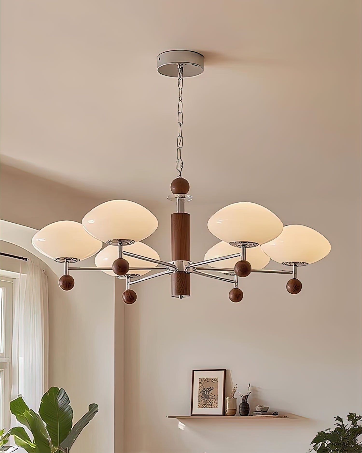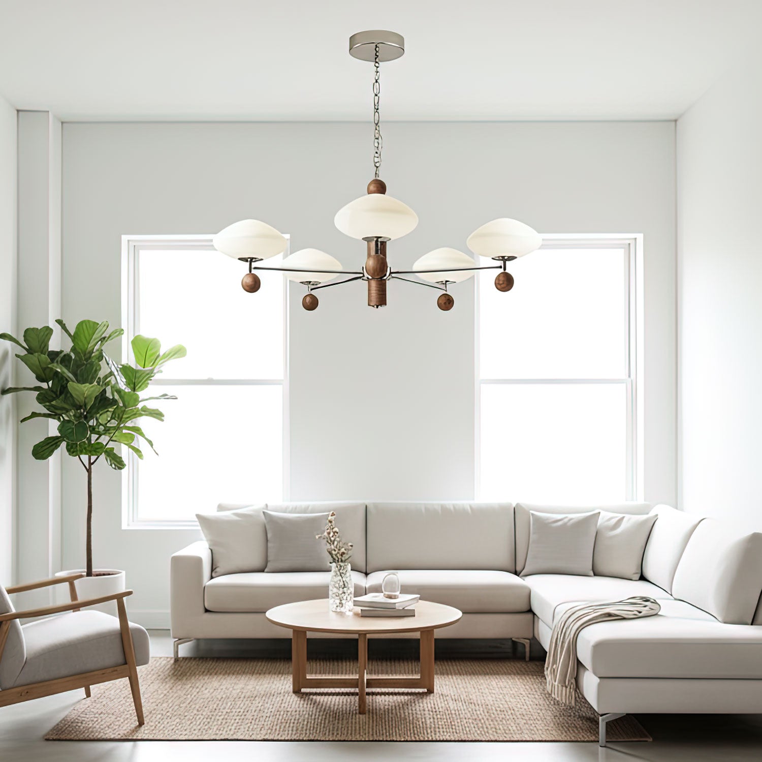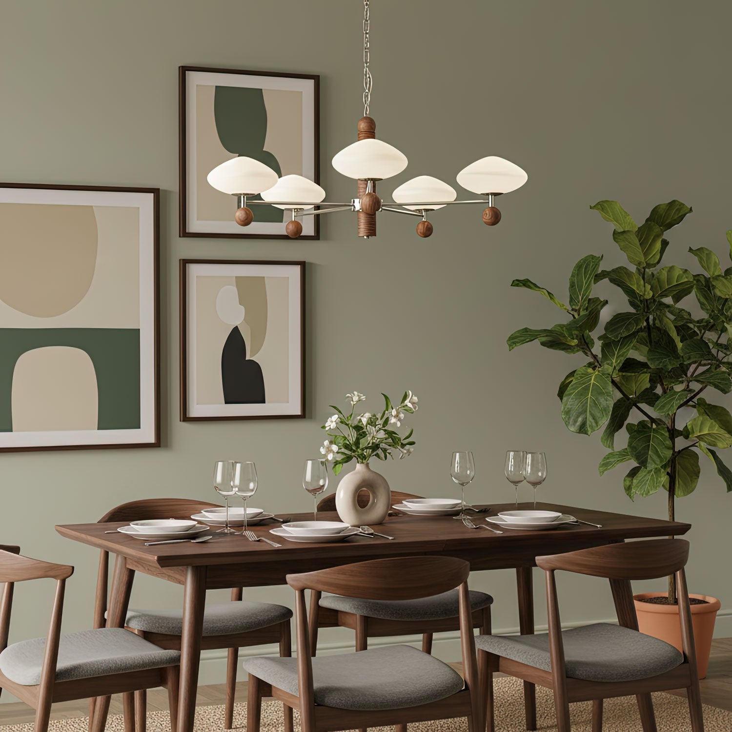 The Puja Chandelier merges modern sophistication with natural warmth through its rounded frosted glass shade, which diffuses light softly to create an inviting ambiance. Encased in a sleek metal frame with polished chrome accents, it contrasts elegantly with the rich, earthy wood details that adorn the base and arms. A delicate dangling chain enhances its refined appeal, making it a versatile centerpiece for dining rooms, living areas, or entryways. This chandelier embodies a perfect balance of style and comfort, delivering lasting elegance to any interior.