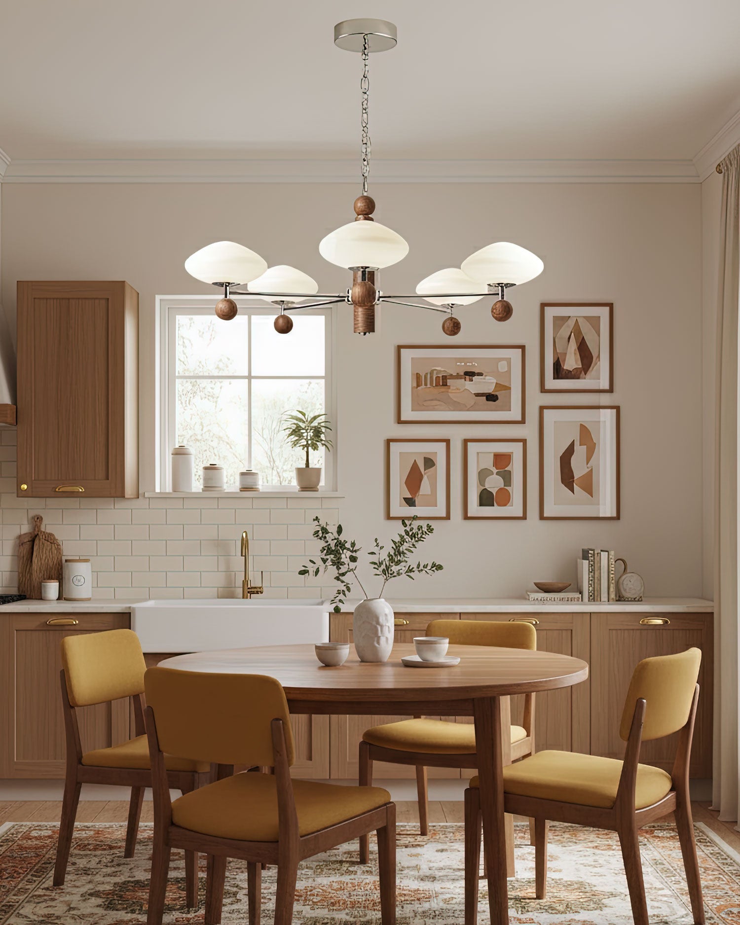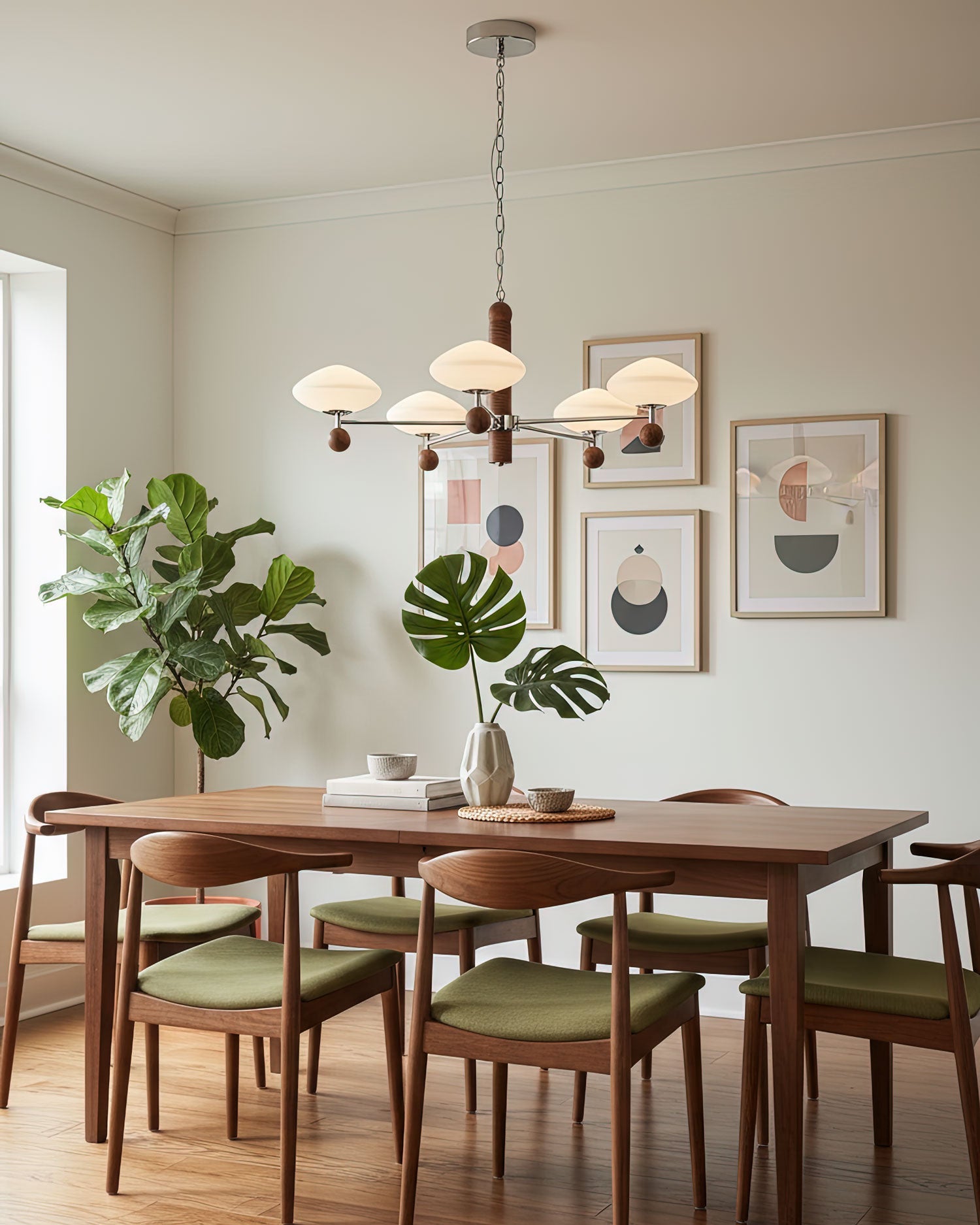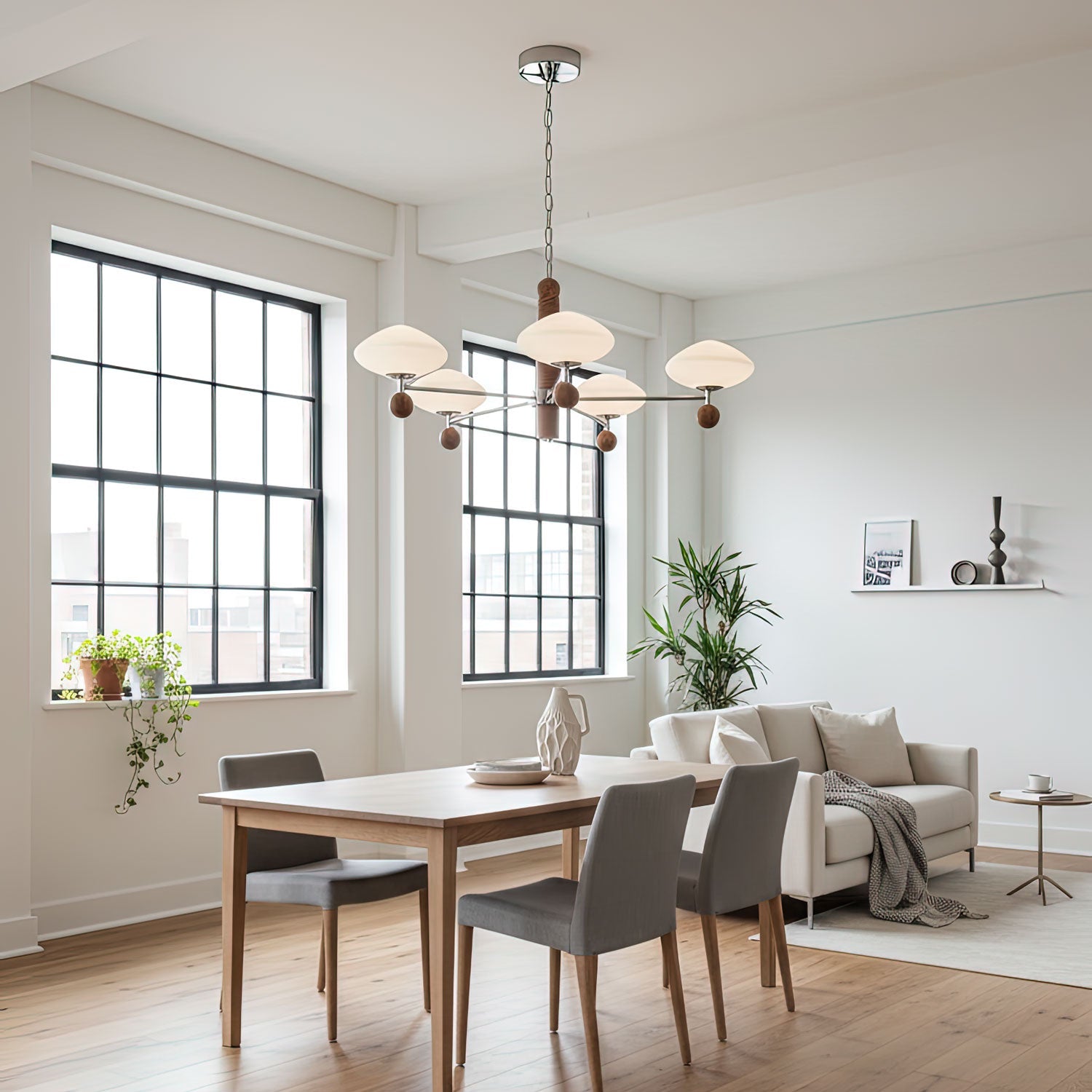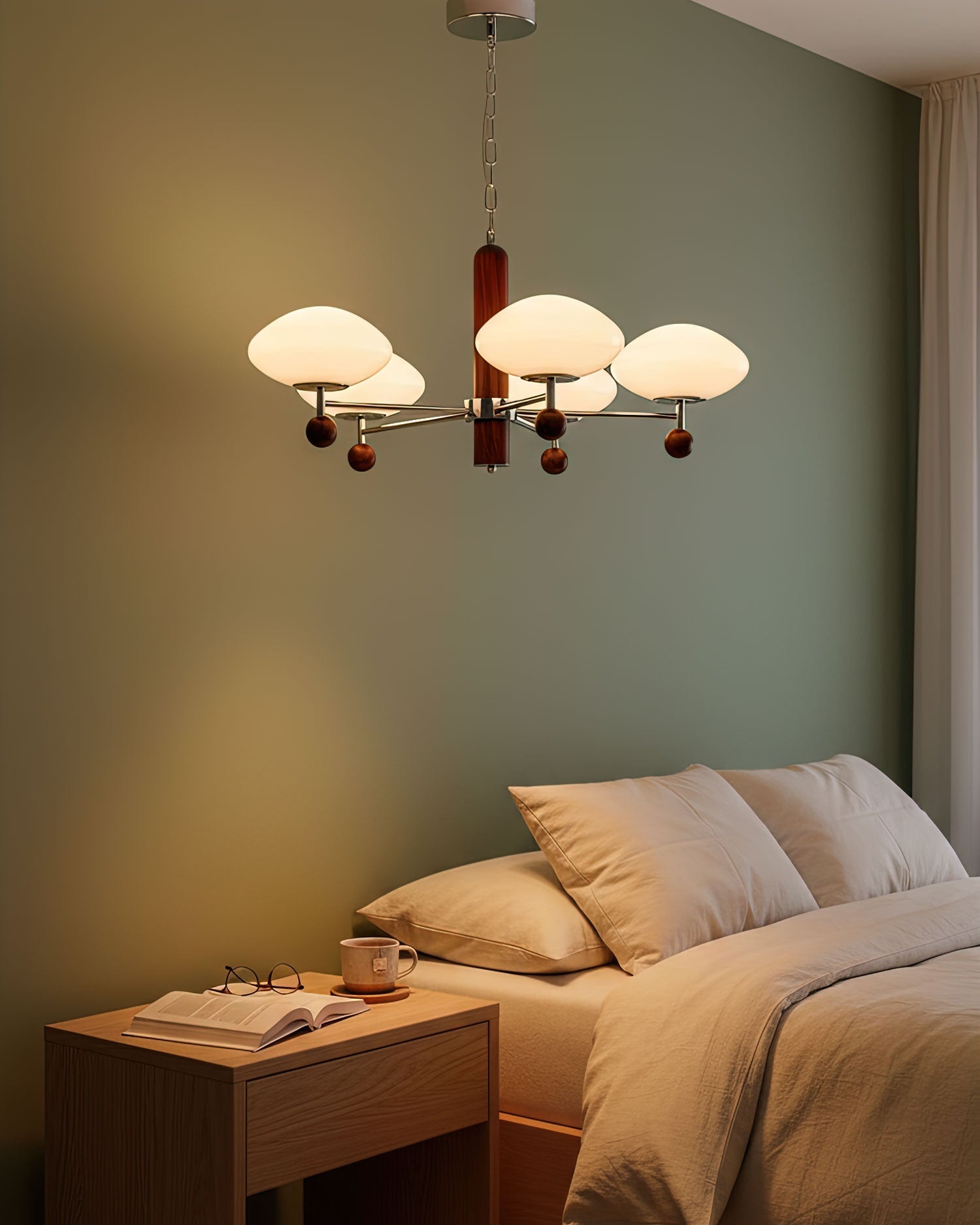 The Puja Chandelier merges modern sophistication with natural warmth through its rounded frosted glass shade, which diffuses light softly to create an inviting ambiance. Encased in a sleek metal frame with polished chrome accents, it contrasts elegantly with the rich, earthy wood details that adorn the base and arms. A delicate dangling chain enhances its refined appeal, making it a versatile centerpiece for dining rooms, living areas, or entryways. This chandelier embodies a perfect balance of style and comfort, delivering lasting elegance to any interior.
