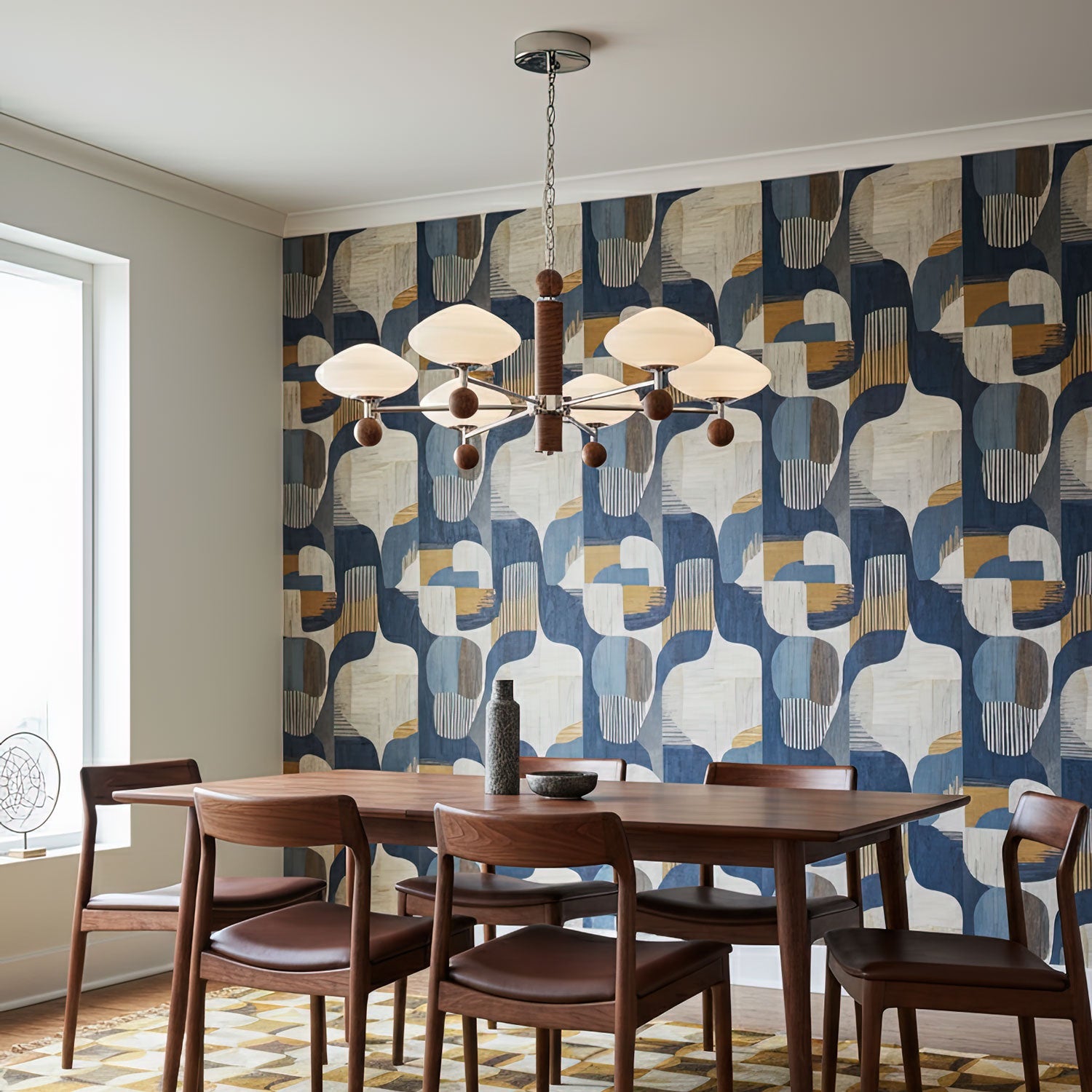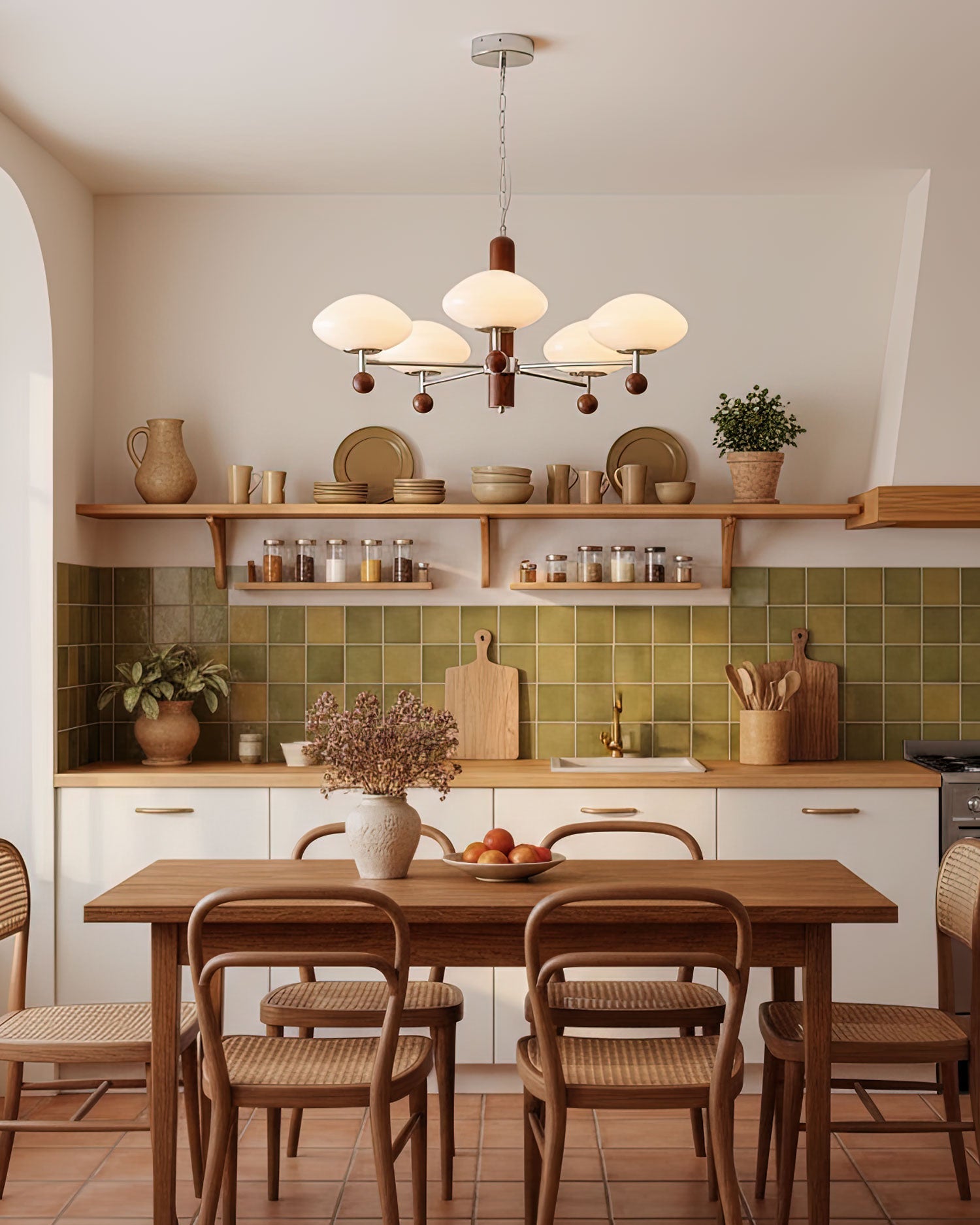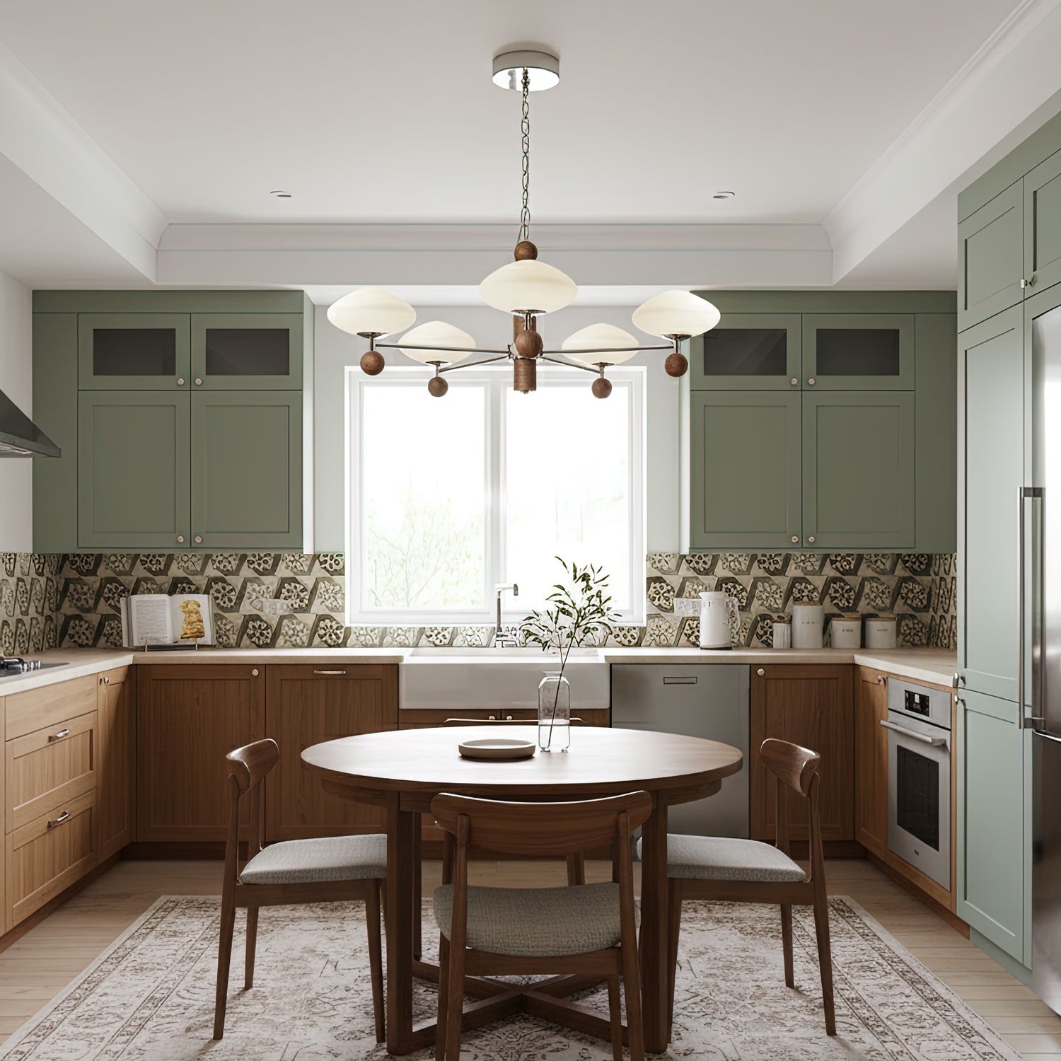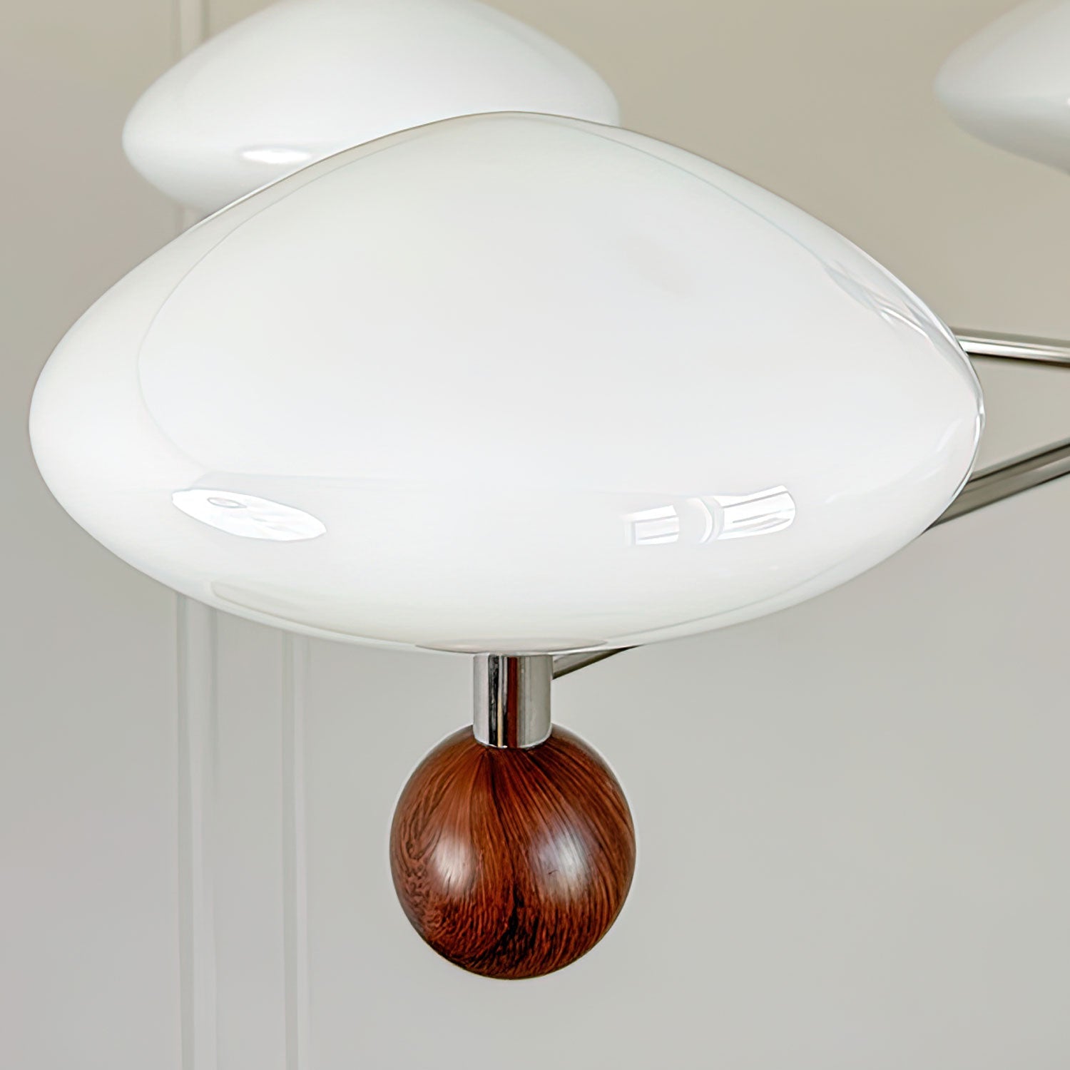 The Puja Chandelier merges modern sophistication with natural warmth through its rounded frosted glass shade, which diffuses light softly to create an inviting ambiance. Encased in a sleek metal frame with polished chrome accents, it contrasts elegantly with the rich, earthy wood details that adorn the base and arms. A delicate dangling chain enhances its refined appeal, making it a versatile centerpiece for dining rooms, living areas, or entryways. This chandelier embodies a perfect balance of style and comfort, delivering lasting elegance to any interior.
