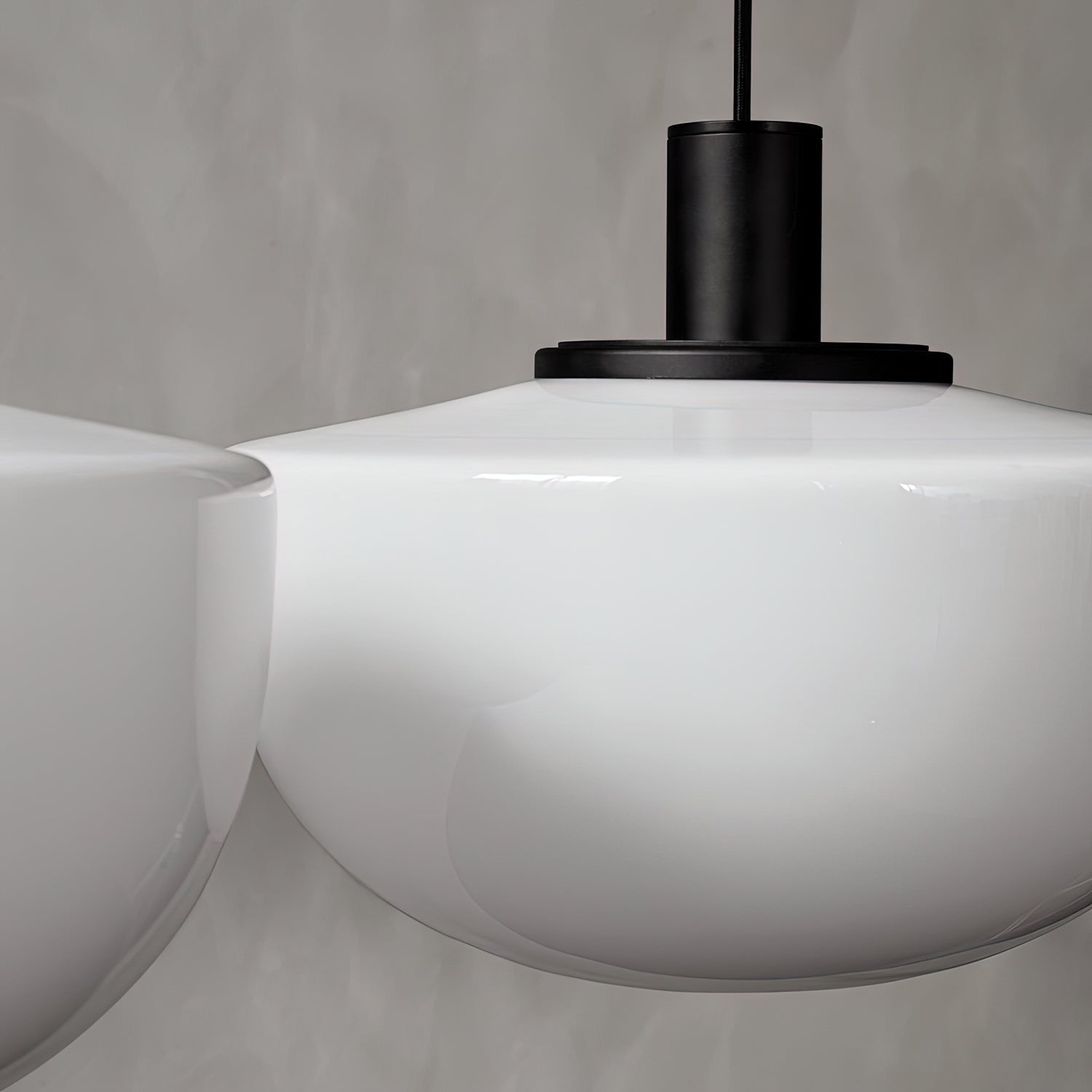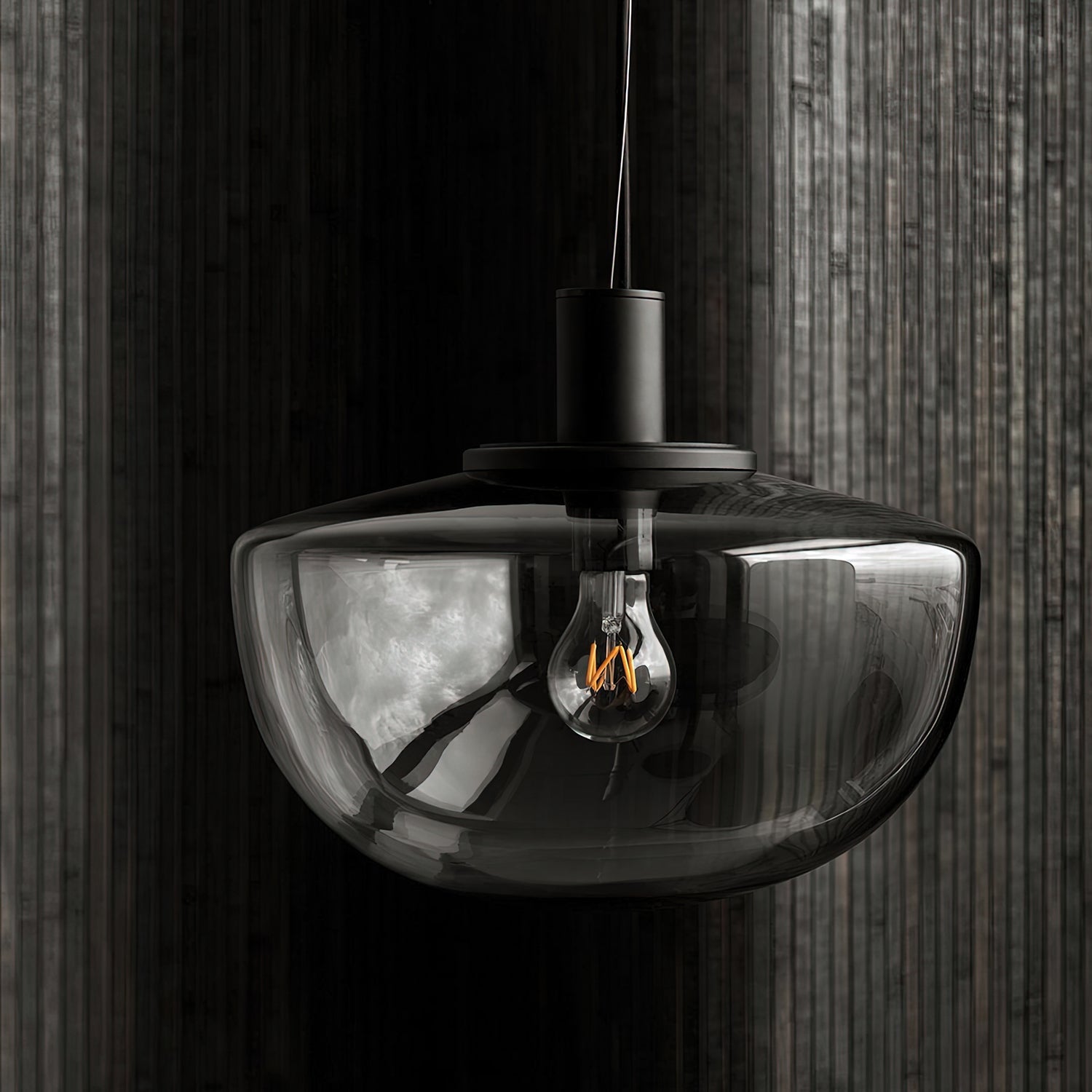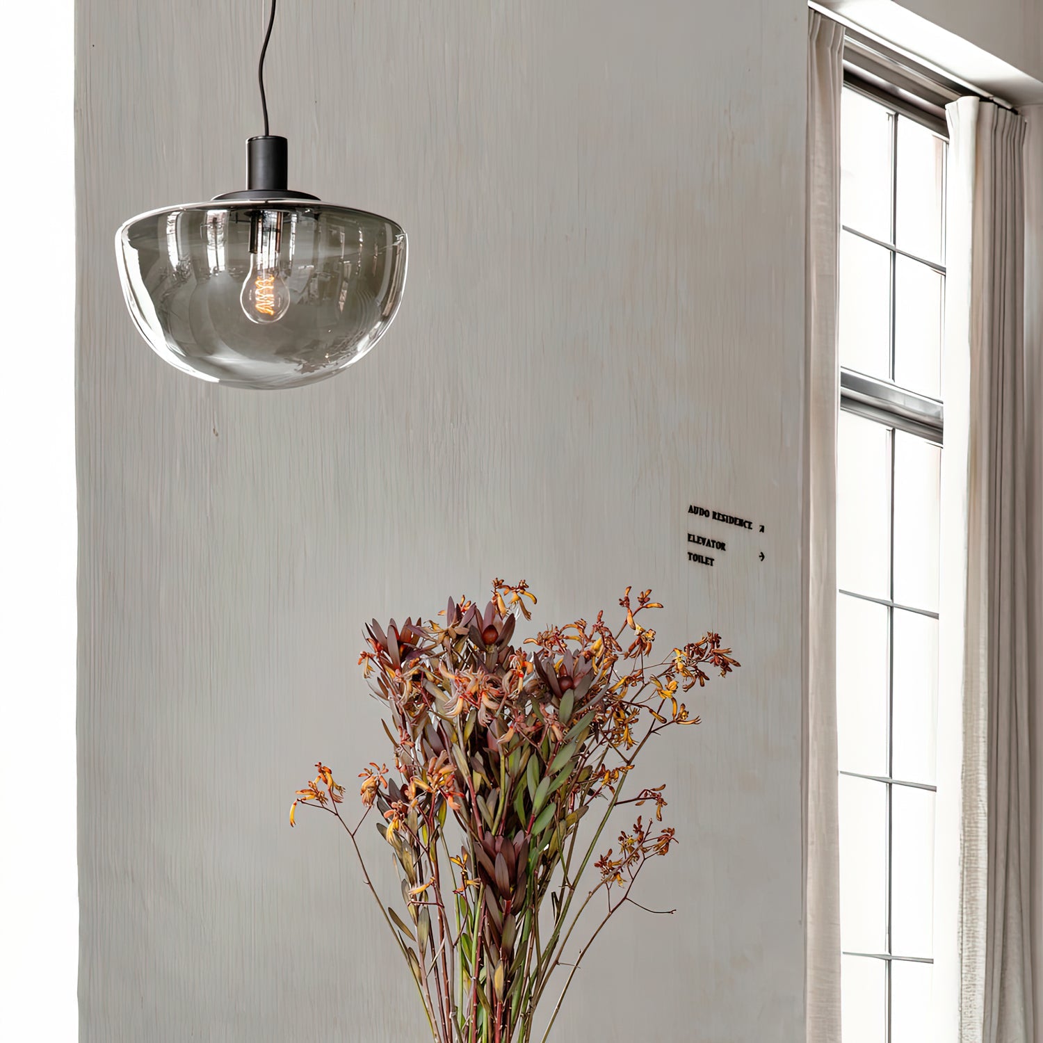The Ripon Pendant Light features a semicircular blown glass shade accented with black powder-coated aluminum for a sophisticated, modern look. Its carefully designed diffuser casts a soft, 360-degree light, perfect for creating a warm ambiance in any room. The elegant combination of glass and sleek black metal creates a striking focal point, creating a cohesive atmosphere whether used alone or paired with other pendant lights.
