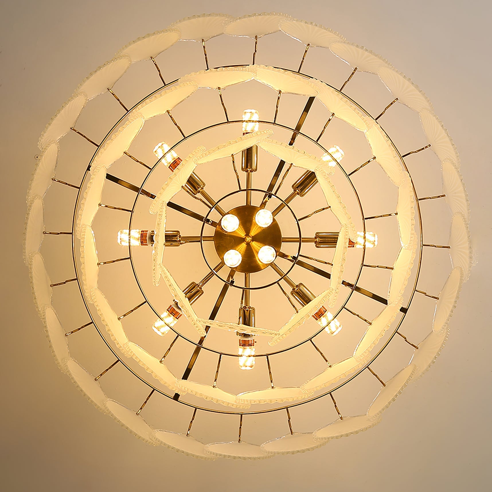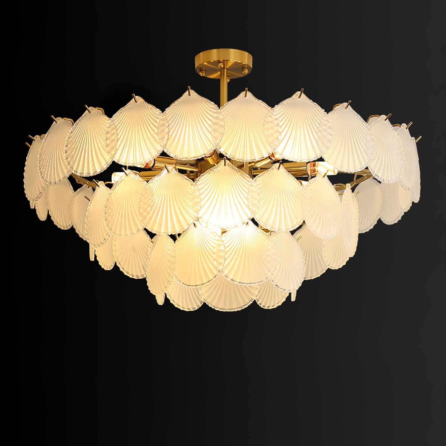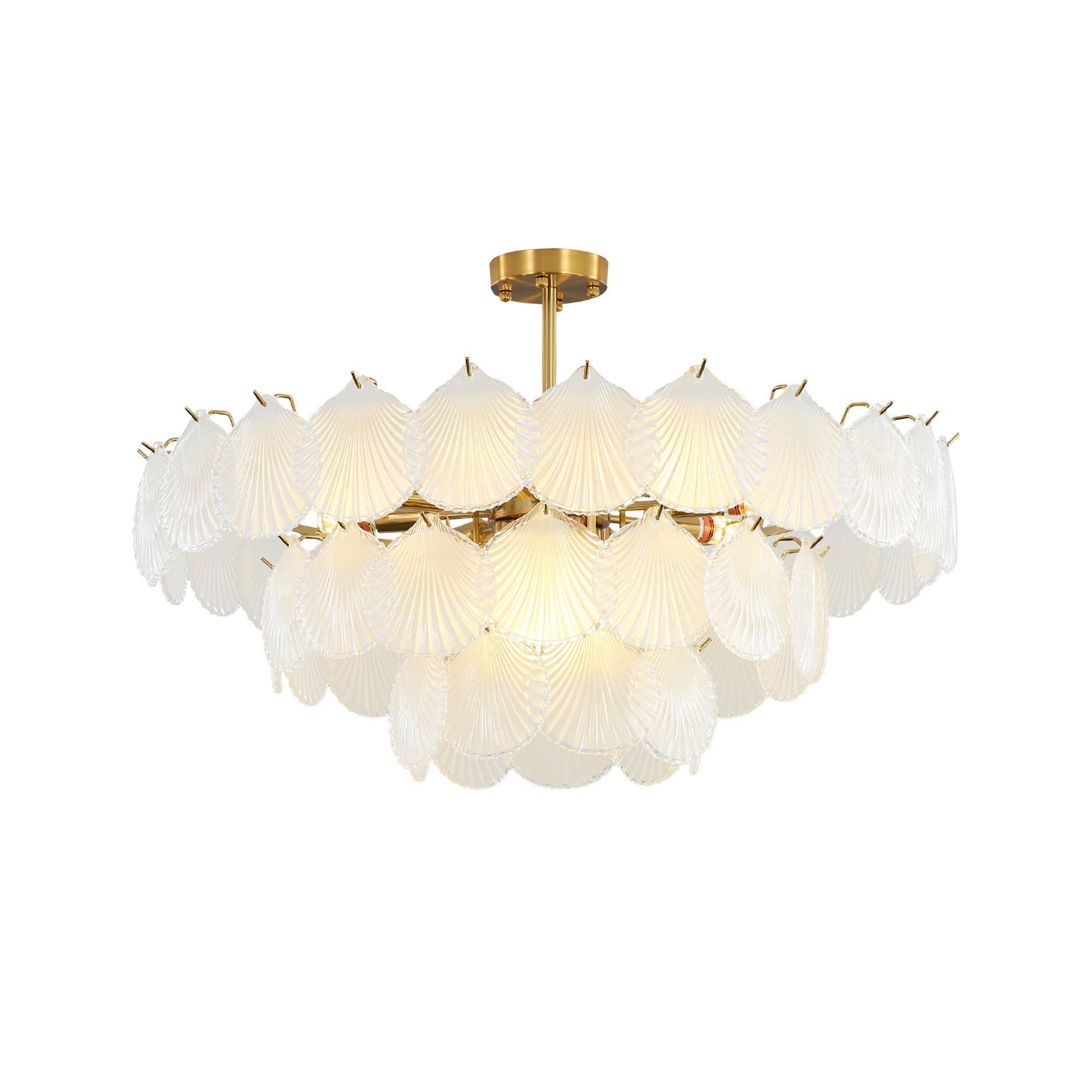A glamorous take on coastal-chic, this Chandelier redefines any room with unmatched splendor. Three tiers of white frosted glass designed after scallop shells cast soft, whimsical light when lit, and its chic gold finish beautifully elevates aesthetic prowess.