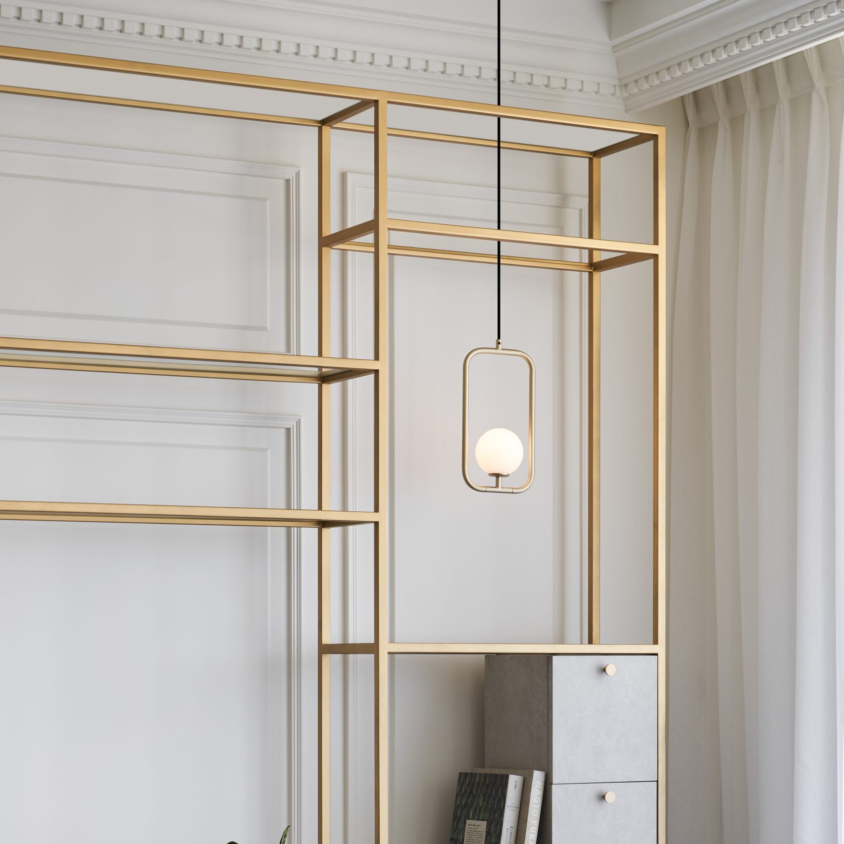 Sircle Pendant lamp, a symbolization merged Square and Circle, inspired by the East aesthetic philosophy, the circular light ball just like a soft tender mind leans on the rigid prudent frame, chemically shaped a harmonious feature with its flexible body inside-out. Meanwhile, the fantastic performance of light through the opal mouth-blown glass, spreading the beauty of moonlight all over the space.