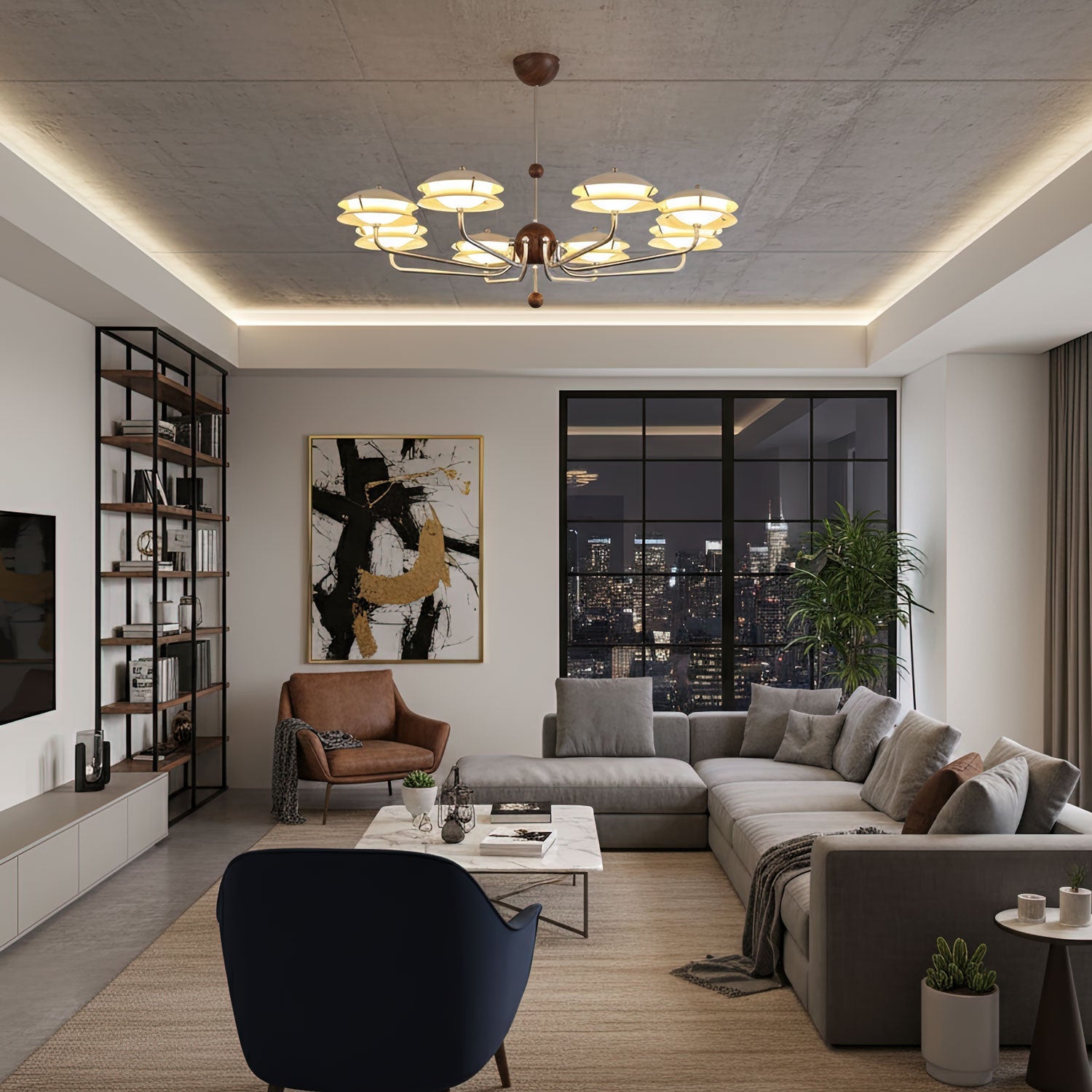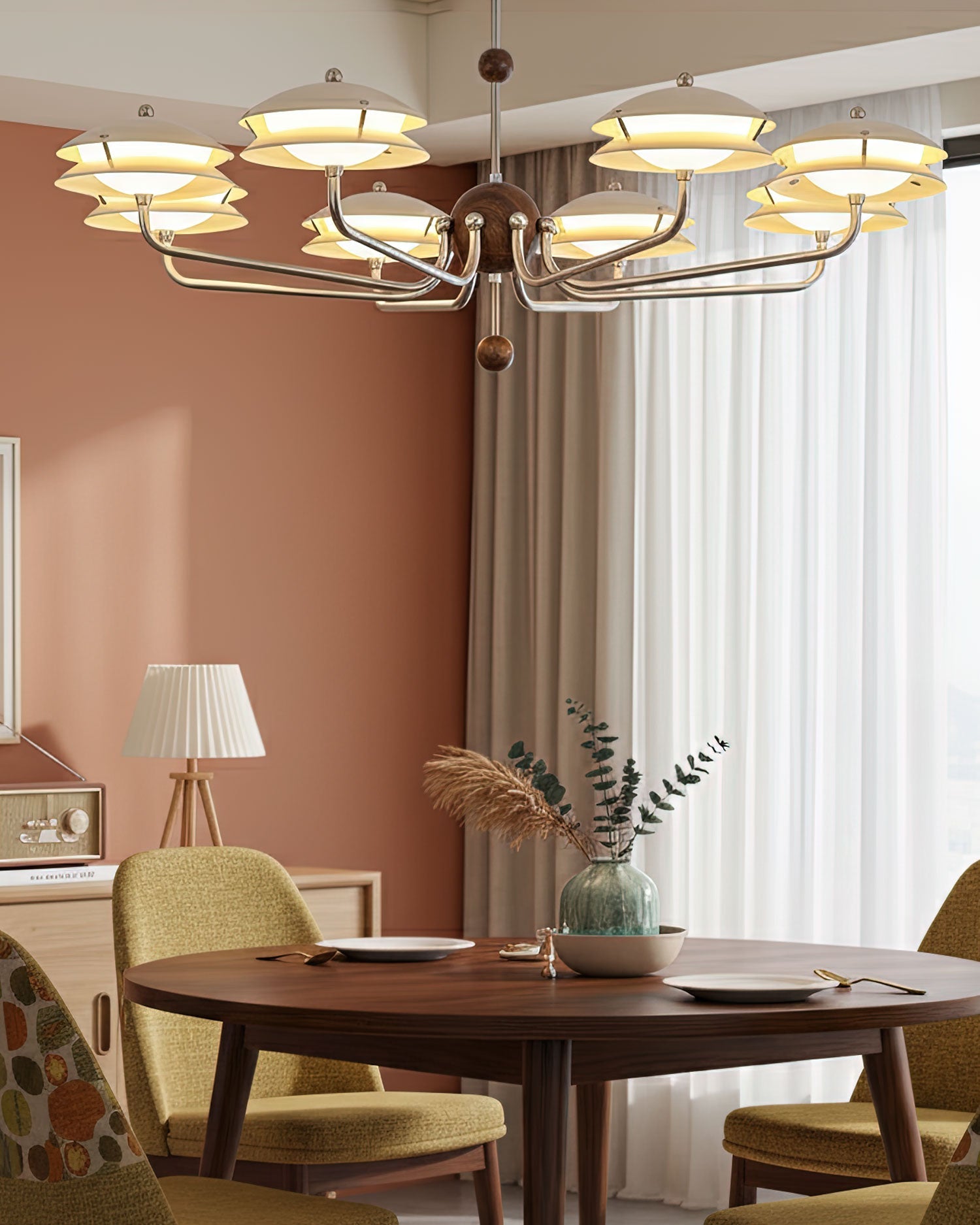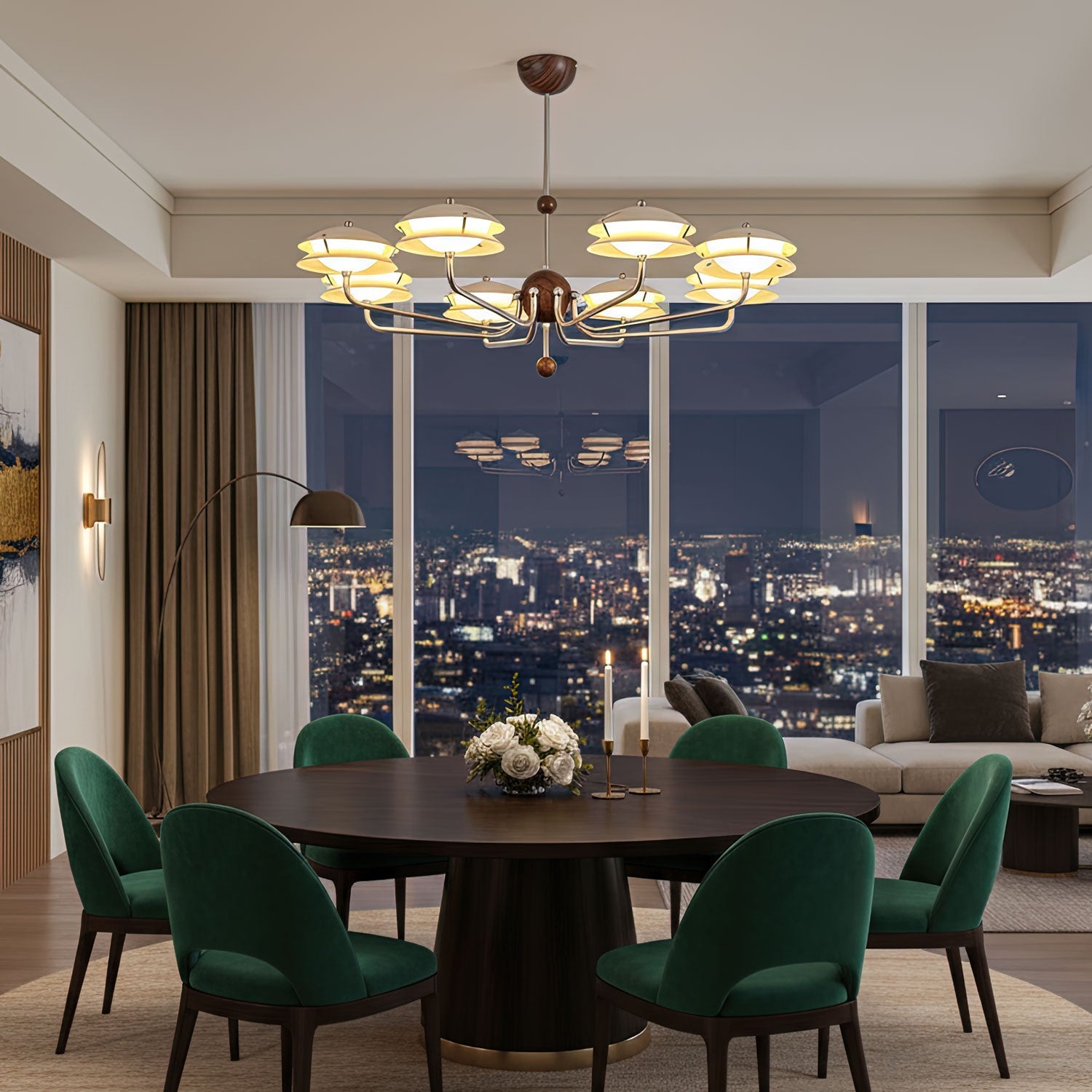 The Sistrah Chandelier embodies a refined Mid-Century Modern aesthetic, with semicircular glass shades gracefully cascading around a central wooden base. The warm wood tones complement the soft light, creating a balanced and inviting atmosphere. Symmetrically arranged metal arms extend in a floral pattern, lending it a sense of movement and architectural beauty. Ideal for a spacious dining room or living room, this chandelier seamlessly blends classic design with modern elegance, elevating any space with its timeless style and exquisite craftsmanship.