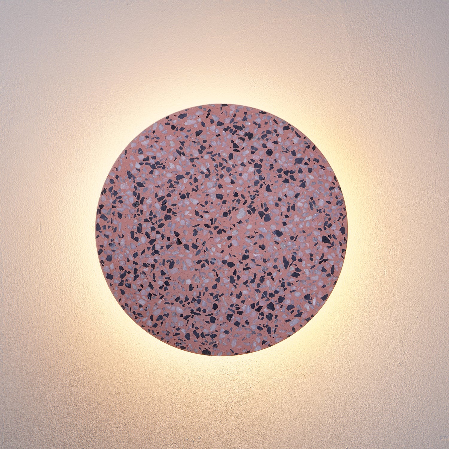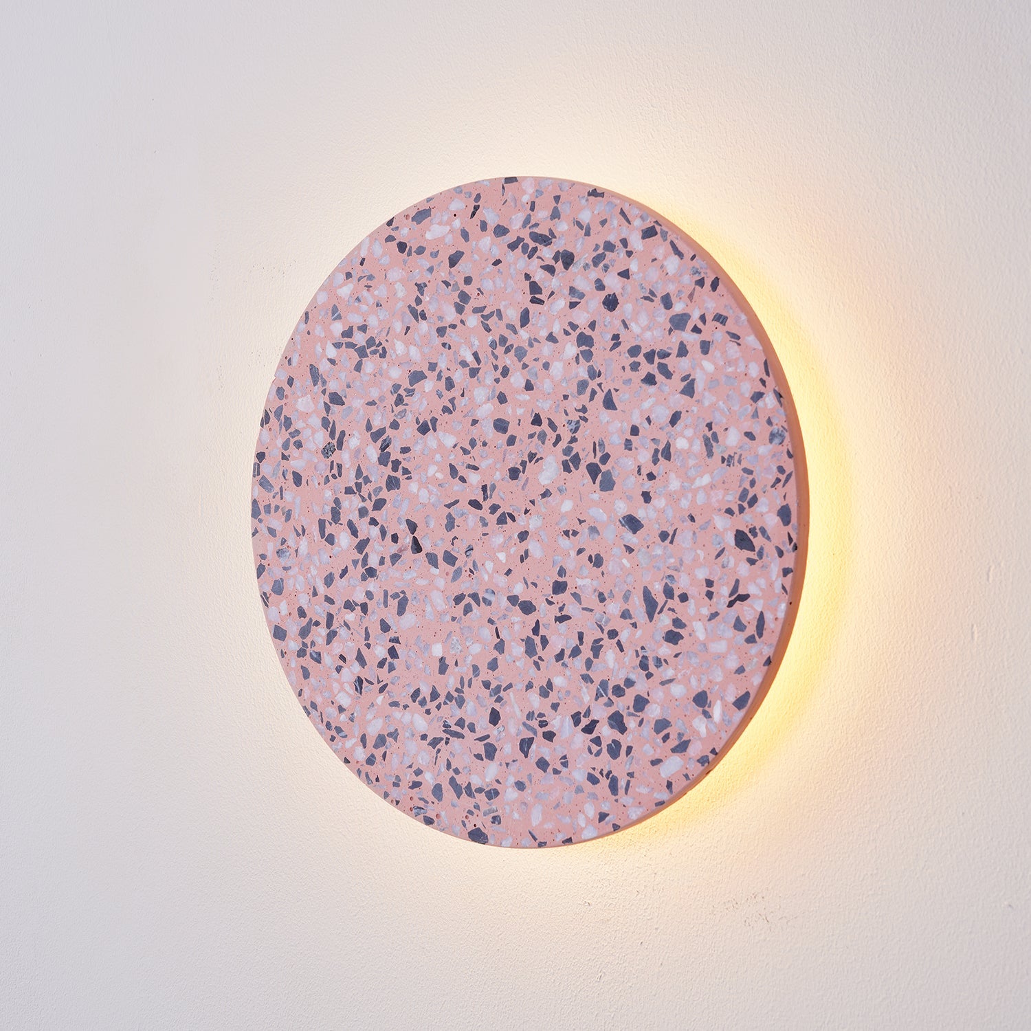 A floating terrazzo disc, offset and backlit through a thoroughly resolved prism, creates an impression reminiscent of celestial orbs in eclipse. Terrazzo Wall Light is IP65 rated and suitable for indoor and outdoor use. Available in two diameters and depths, and four colors, the Terrazzo Wall Light is perfectly suited as a sculptural cluster, or equally stunning on its own.