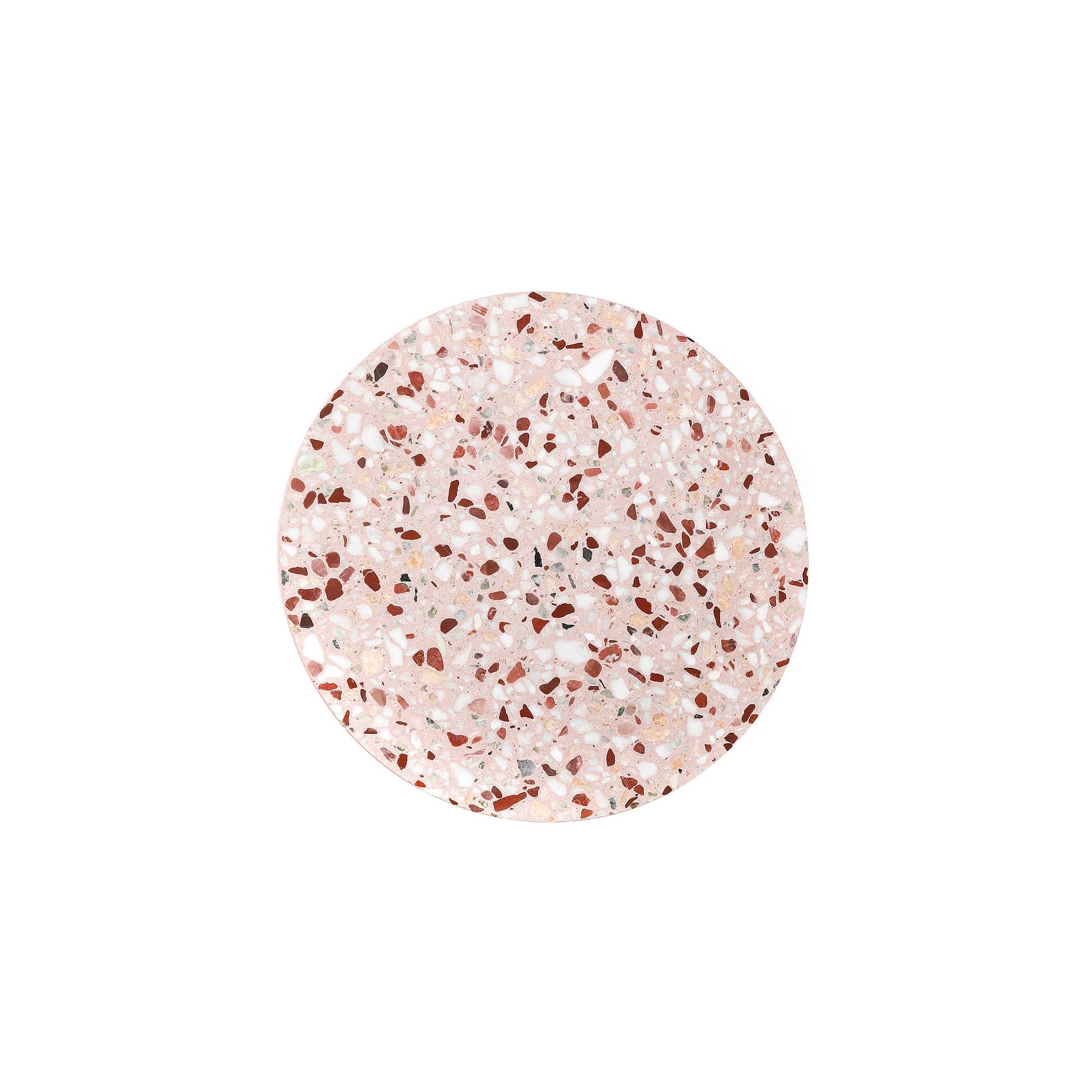 Terrazzo made from recycled stone and ceramic aggregate mixed with UHP concrete, with a smooth machined finish. Terrazzo available in black, white, red or blue. Acrylic prism. Black anodized aluminum body.