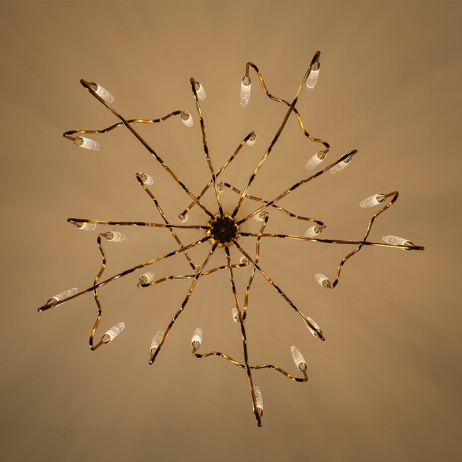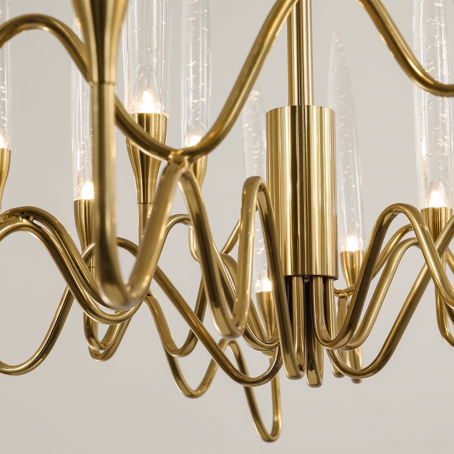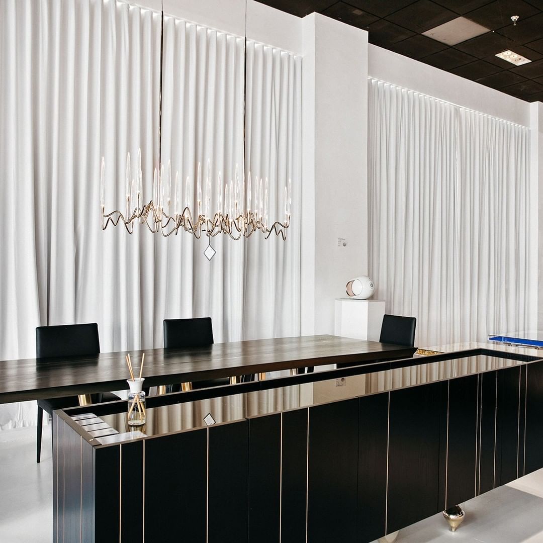 Illuminate your space with the Trinity Candles Chandelier. Inspired by Arabic calligraphic art, this elegant chandelier features a hand-forged metal structure and "candles" made of clear solid crystal. Powered by advanced LED technology, it creates a sophisticated and romantic lighting experience. Upgrade your home with this timeless piece.
