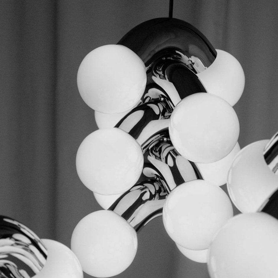 The Vine series introduces exaggerated form with propensity for repetition resulting in a bold impact. Composed of a poised chrome arc flanked by two glowing glass globes—the multiplication of the module enables the fixture to grow, exponentially overstating the fixture’s overall silhouette.