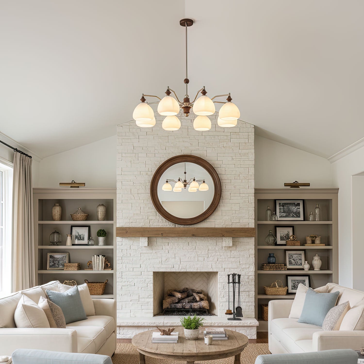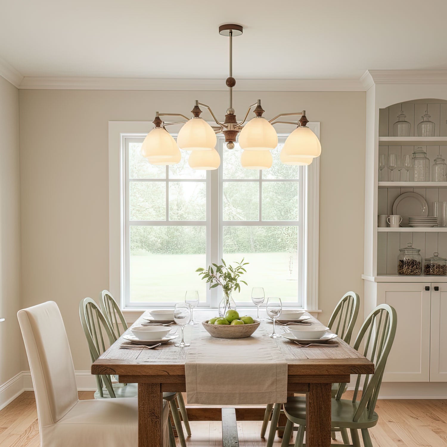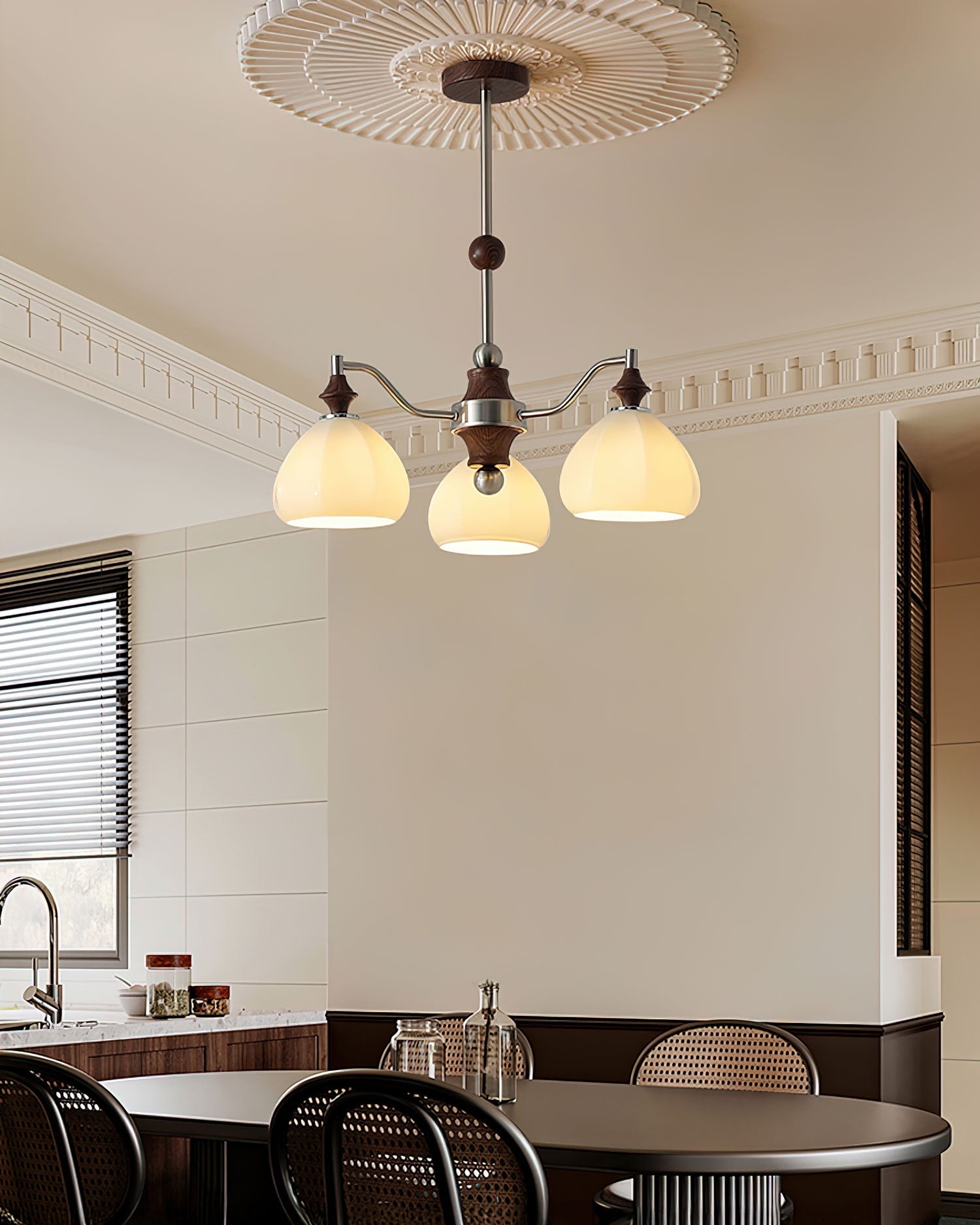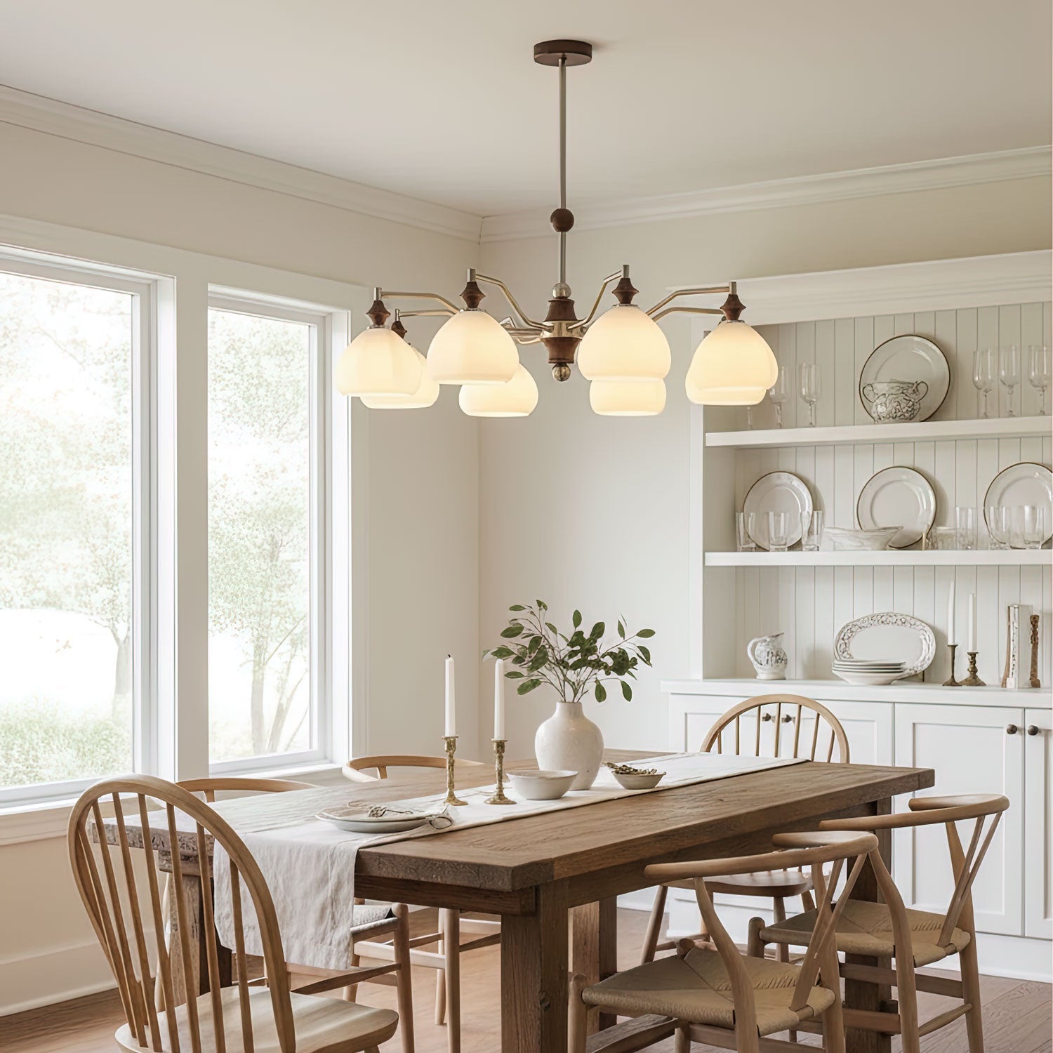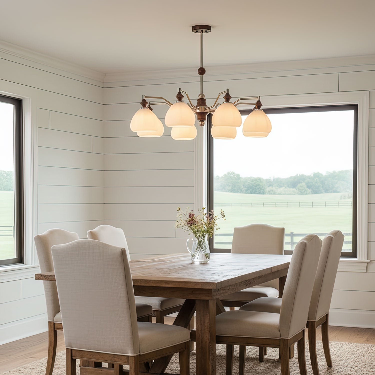 The Viva Chandelier offers a refined blend of classic elegance and contemporary design. Featuring softly curved milk glass shades that emit a gentle amber glow, it fosters a calming and inviting ambiance. Its metal frame, enhanced with tasteful wood accents, introduces warmth and texture, making it an ideal centerpiece for dining rooms or living areas. This chandelier’s balanced composition delivers understated sophistication, elevating everyday spaces with a harmonious combination of light and form.