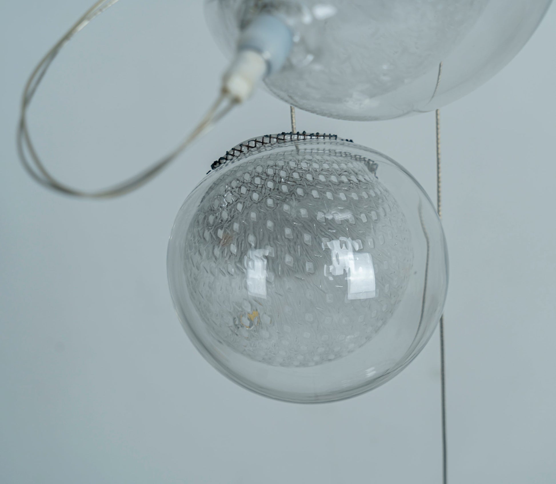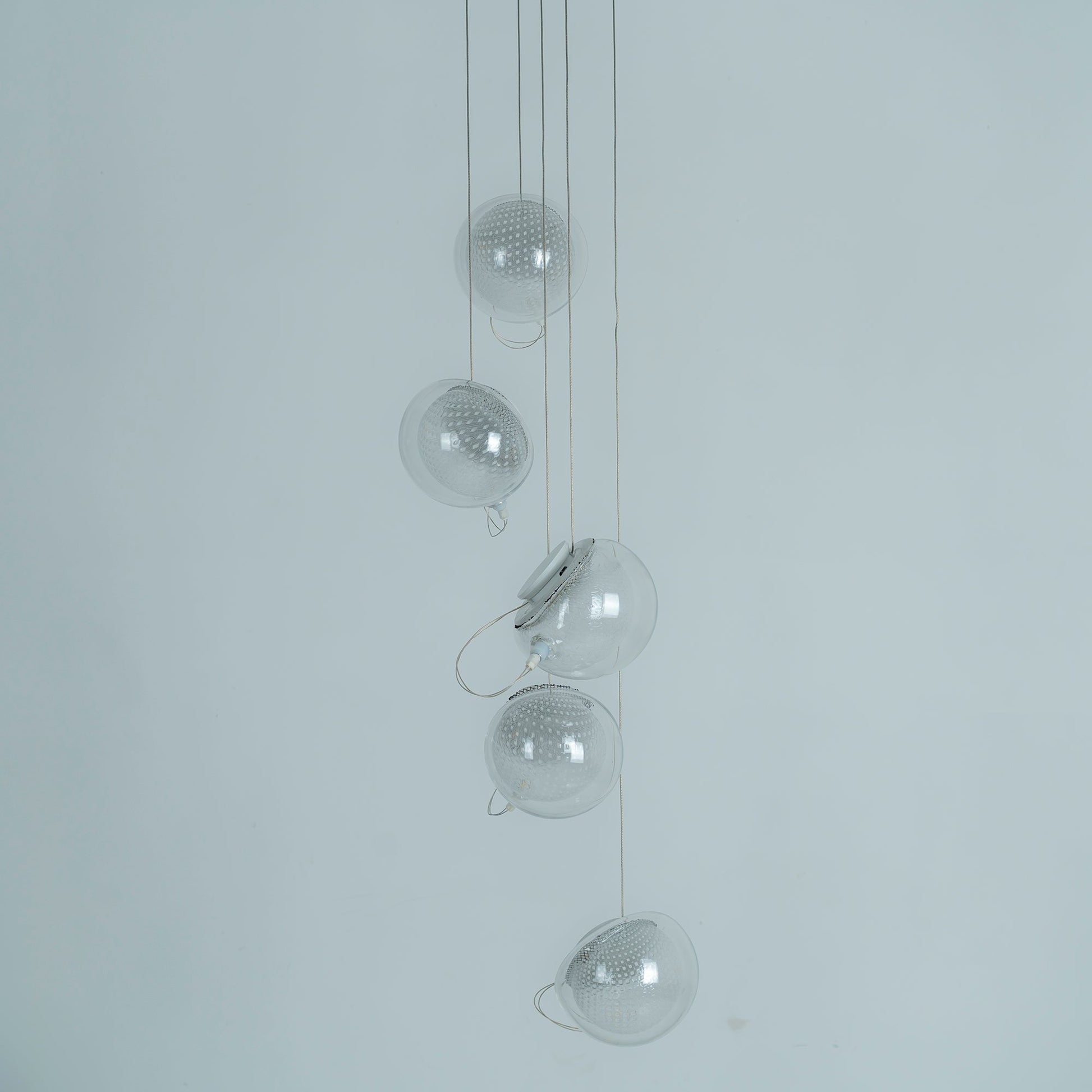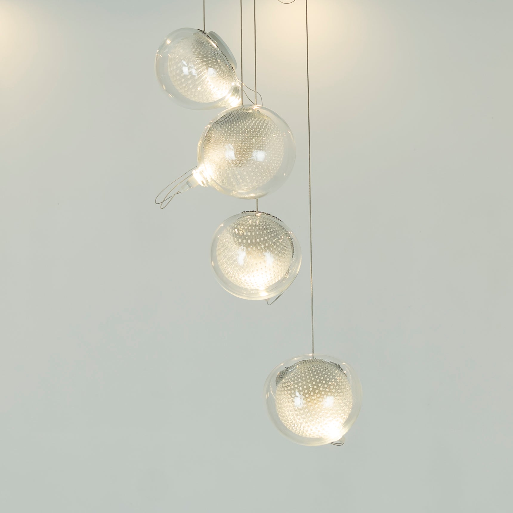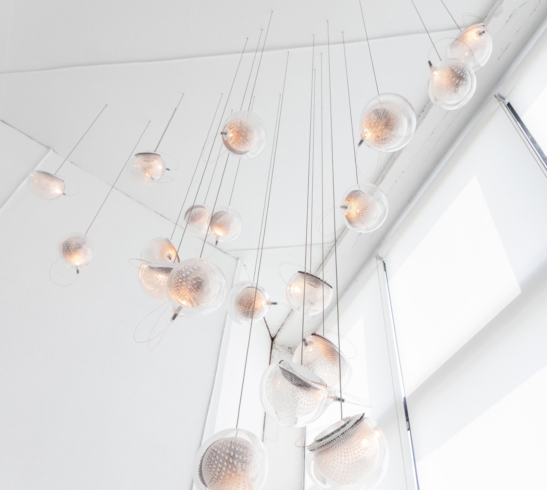 A vacuum is introduced to a strata composed of hot white and clear glass with copper mesh between; the vacuum causes the white layer to pull away through the embedded mesh, leaving numerous tendrils of white glass suspended within an interstitial space as it goes.